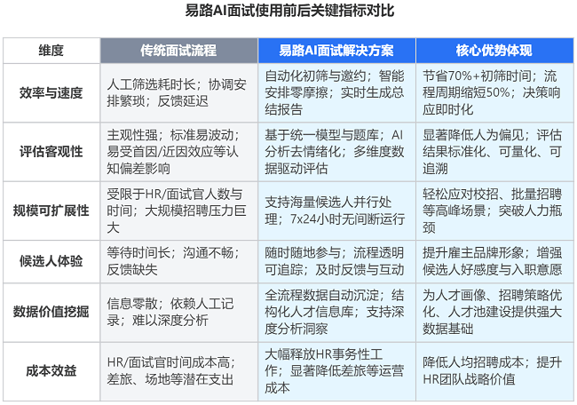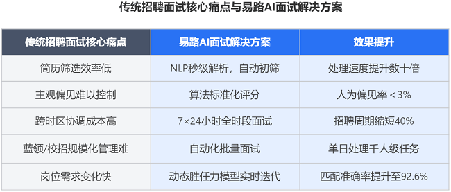 在易路方案里,于简历筛选这个环节,运用了NLP技术,达成了秒级处理上千份简历的成果。在2023年的行业数据当中表明,以传统方式来筛选每份简历,需要耗费3分钟,然而AI系统筛选同样一份简历仅仅只需2秒。