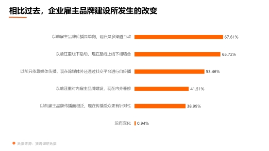 当下,有超过九成的企业,显著加大了雇主品牌建设方面的投入力度。猎聘的调研数据表明,在这些企业中,有97.48%的HR,明确感觉到企业对于此领域的重视程度,一直在持续增强。另外,近九成的企业,还相应地增加了专项预算。而这种变化,体现出了现代企业对于人才吸引力这一因素的战略认知在不断深化,它们把雇主品牌当作人才竞争的核心要素加以重点对待,对其愈发看重 。