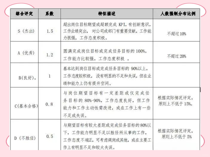 评为杰出的管理人员,其评选存在明确比例限制,此比例是考核总人数的10% 。评为优秀的管理人员,其评选也有明确比例限定,该比例为考核总人数的20% 。这样的强制分布有利于突显真正表现出色、绩效水平高的人员,进而营造出一种良好的、积极向上的内部竞争环境 。